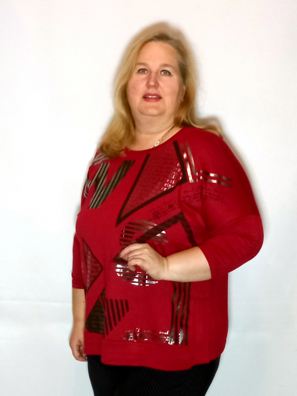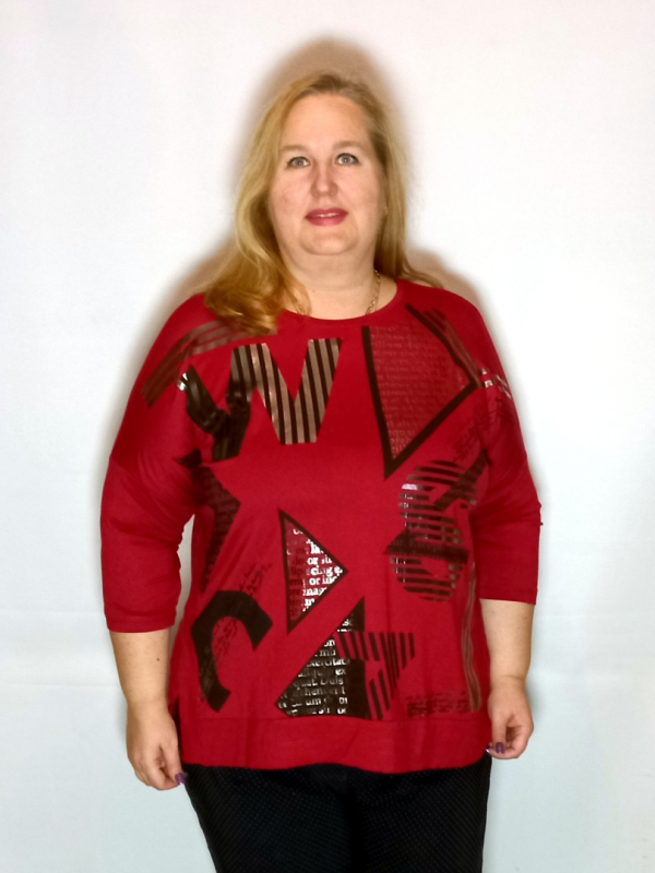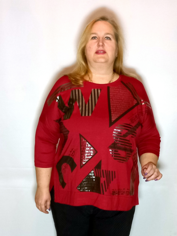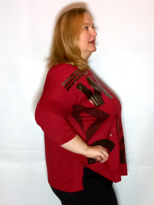 Полочка декорирована прорезиненным принтом с использованием "металлической" краски. По низу широкий манжет из ткани сложенной вдвое.