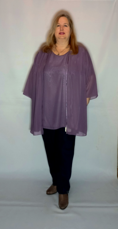 Комплект состоит из кардиган  и блузы. Выполнены из креп шифона. Ткань тонкая, но не рыхлая, воздушная, не эластичная, приятная и дышащая.